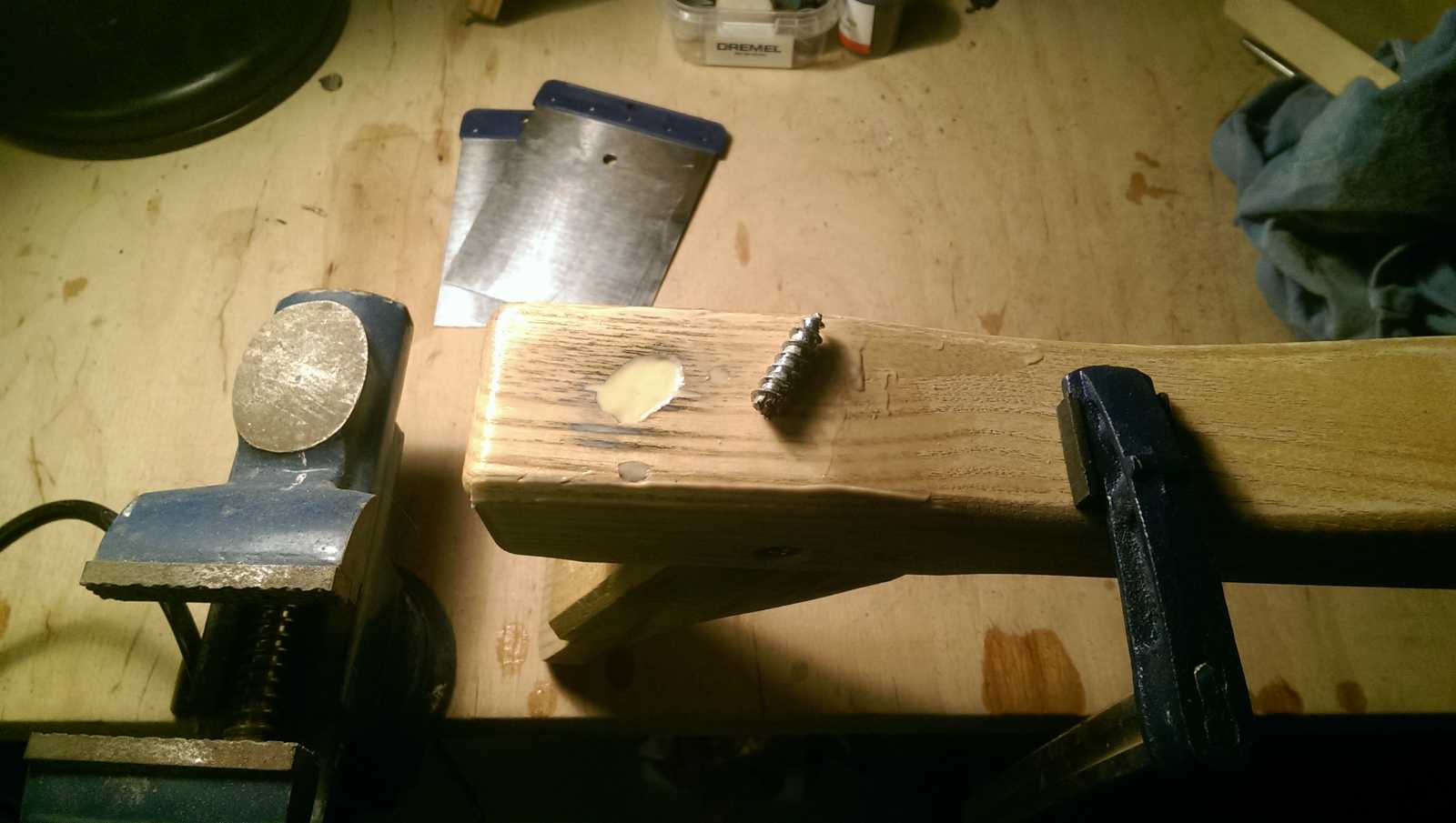 Gefüllt habe ich dann mit einfachen Holzleim, hatte nur einen Schlitz im Holz