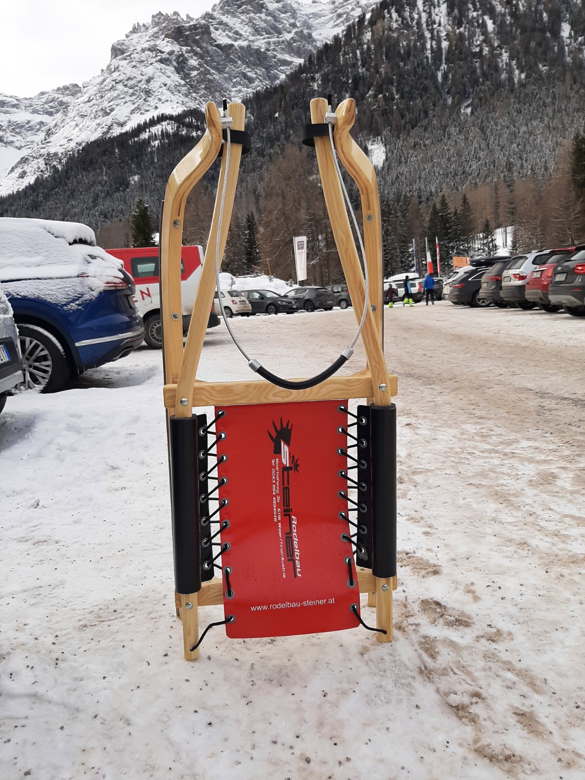 Die neue Rodel vom Karl auf dem Parkplatz in Sexten. Er hat 2 davon, mit unterschiedlicher Geometrie.