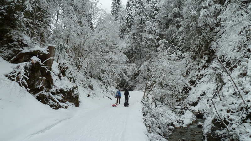 7,8 km haben wir vom parkplatz hohenburg bis zur eingangstür zur hütte, zum runterfahren sind davon max. 6,5 km wirklich rodelbar, weil 1 langer gegenanstieg und ein flachstück auf der strecke liegen. anspruch hat das ganze gar keinen, is halt ein forstweg mit ein paar kehren, ein nettes steilstück und hintenraus knapp 2km zum gleiten (so die wettergötter einem wohlgesonnen sind). es ist auf jeden fall eine schöne winterwanderung, eine wirklich zu empfehlende küche auf der hütte und so man den gipfel am seekarkreuz noch mitnimmt eine wunderbare sicht. in kombination mit dem ersparten abstieg und dafür rodelfreuden ist das ein sehr entspanntes und entspannendes gesamtpaket. fürs reine rodeln isses eher unspektakulär, nachts mi´m lamperl hat das allerdings seinen reiz.