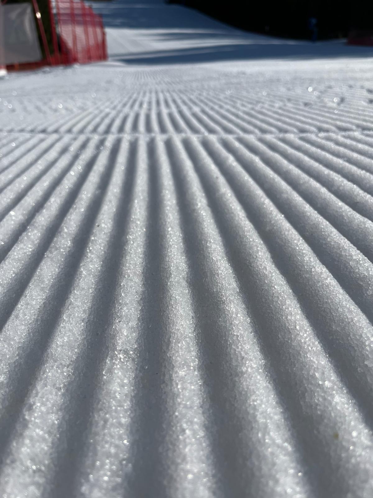 Am Samstag, den 23. März, konnte ich auf der Fraina-Piste in Alpe Lusia den neuen Finisher der Pistenraupe testen, der viel dünnere Furchen erzeugt als man es auf Skipisten findet.